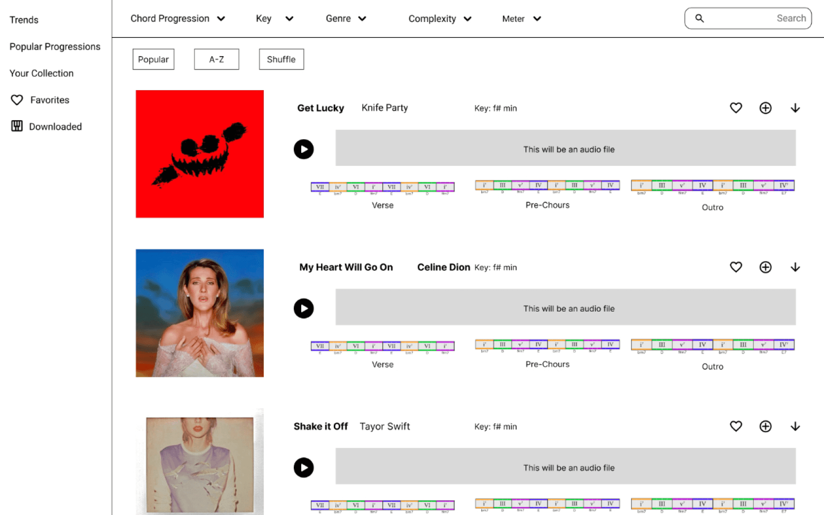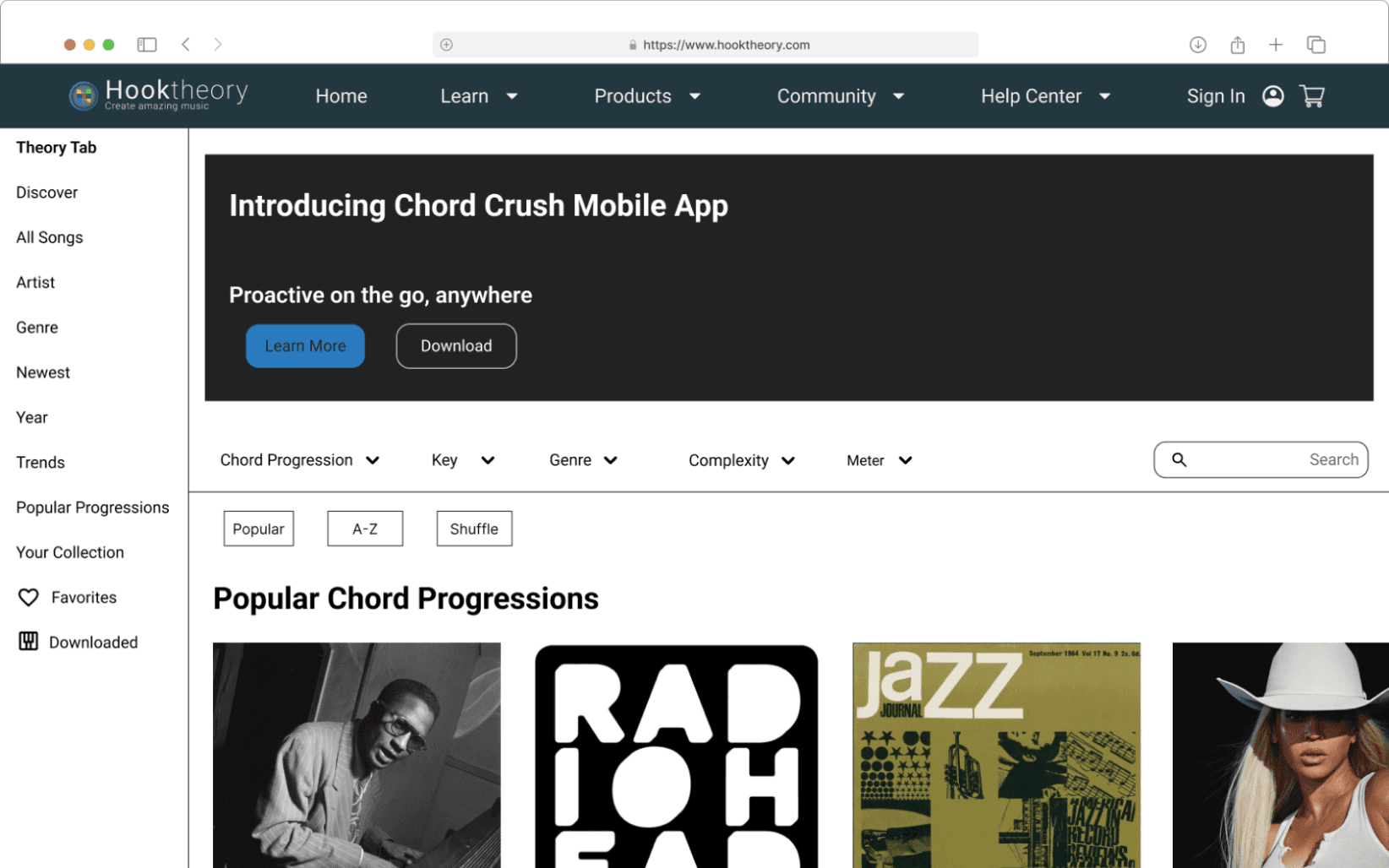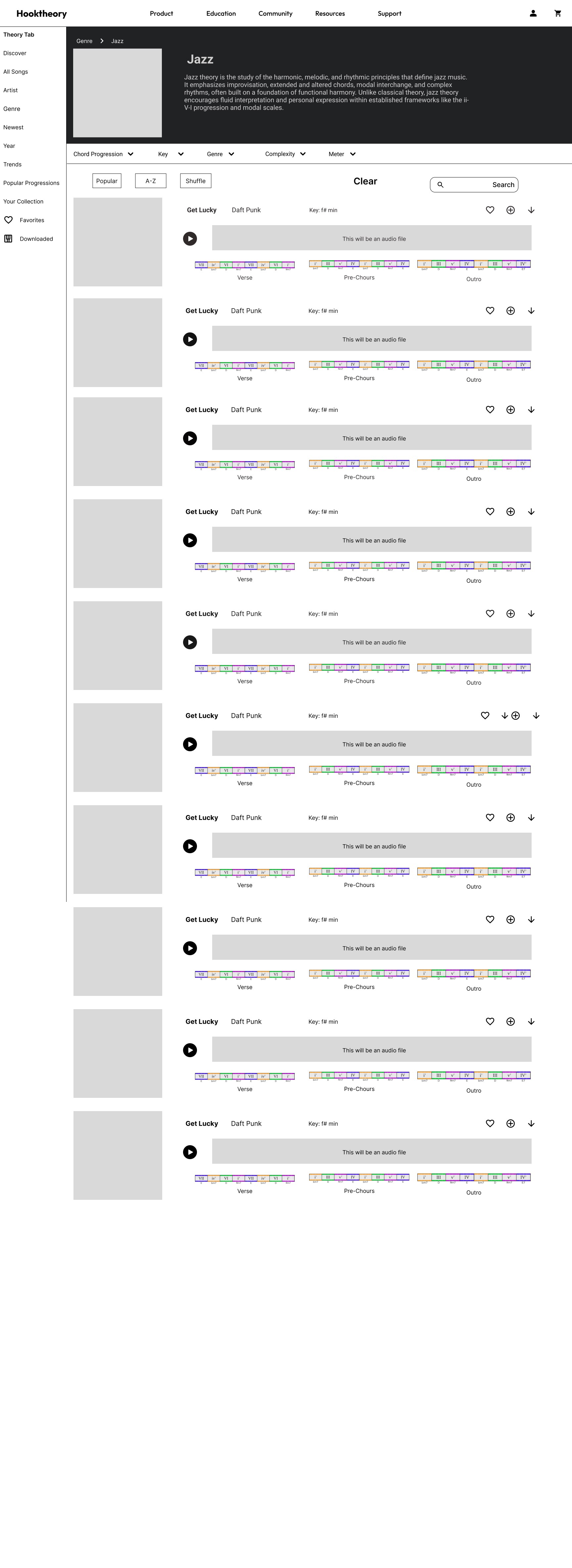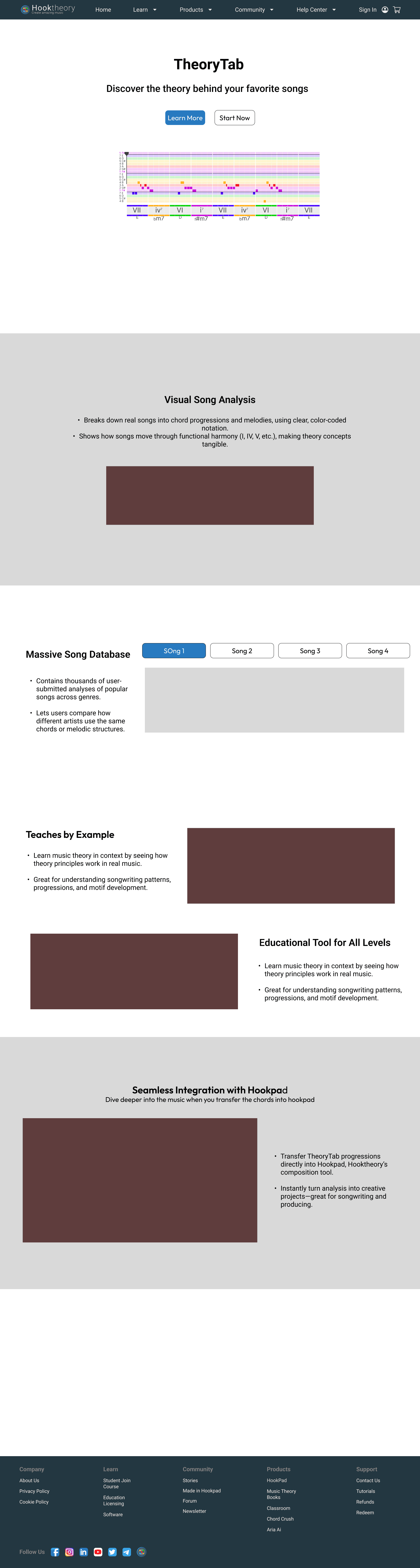 Our proposed new site map is a more streamlined navigation structure designed to serve both Hooktheory's existing users and newcomers visiting for the first time. Carefully considering which item functions as a product or a feature, and how best to communicate that Hooktheory is not only a provider of powerful music creation tools but also a valuable educational resource that enhances users’ musical knowledge.