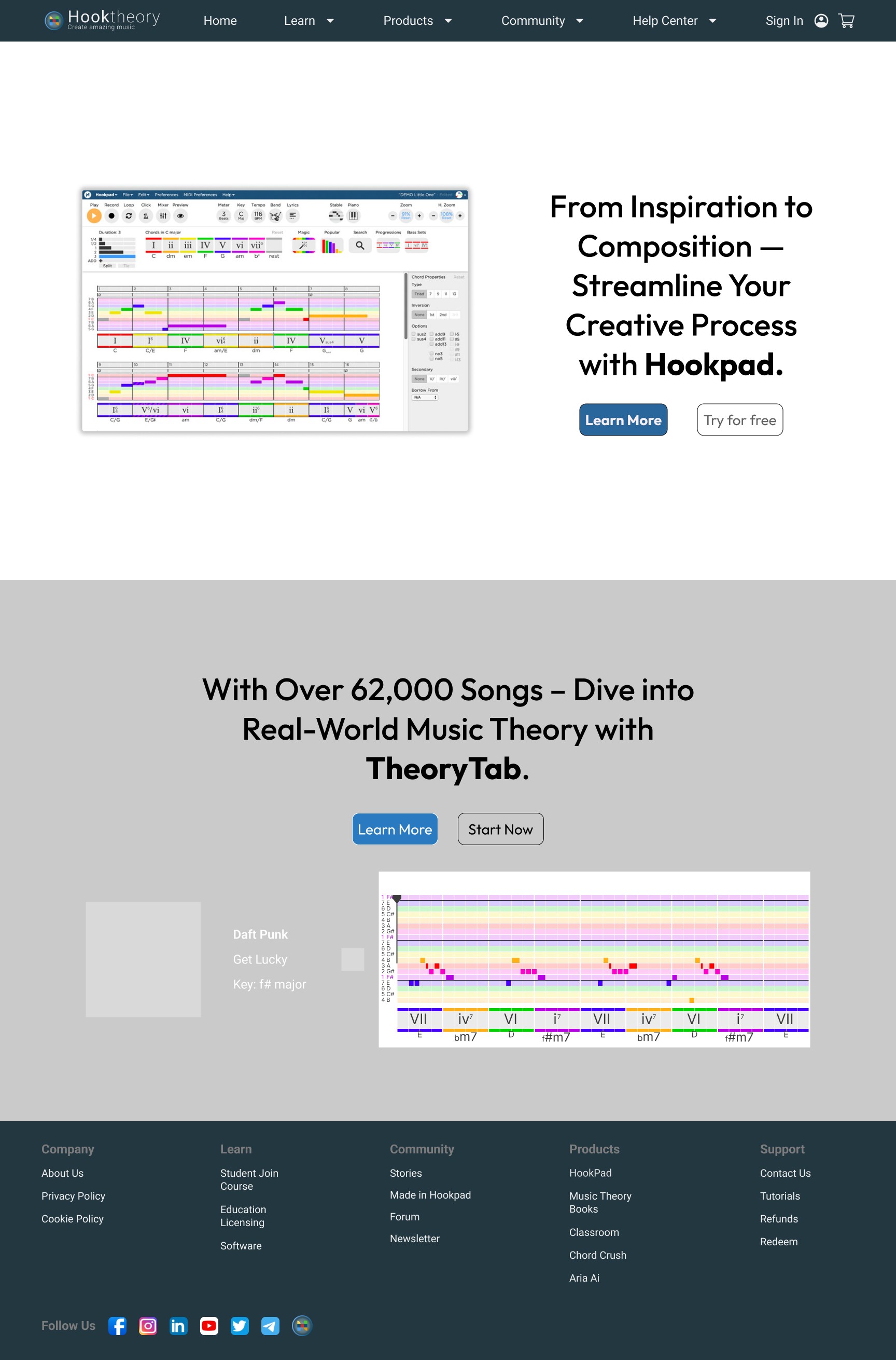 Hooktheory is a music theory platform that helps users of all levels to understand and create music through interactive tools, visualizations, and a vast library of popular songs analyzed by user-made chord progressions and melody.